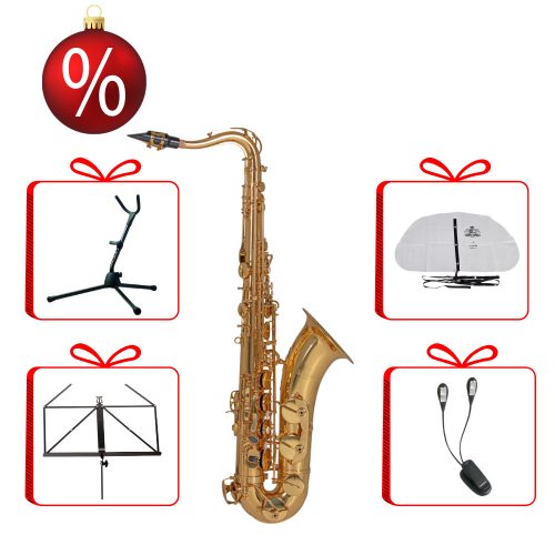 Roy Benson TS-202 sárgaréz tenorszaxofon, arany lakkozással. Kiegészítő billentyű felső F#. Lágyított kialakítású nyakrésszel és megerősített acélrugókkal.